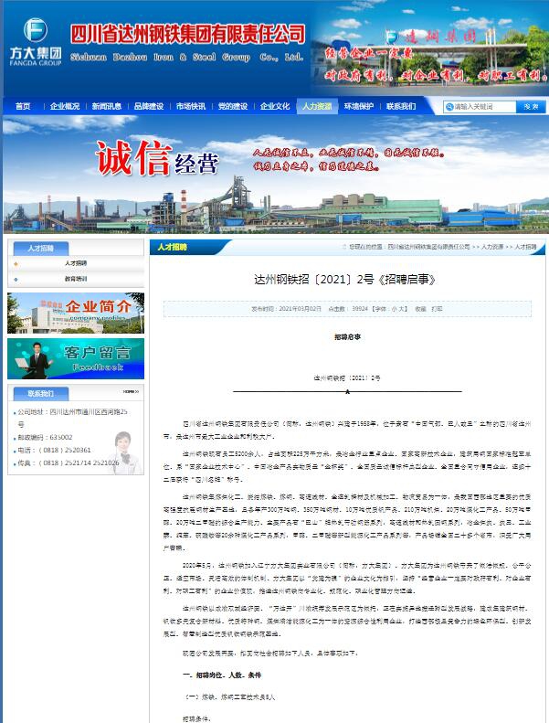 達(dá)聘網(wǎng)(www.0818rc.net)達(dá)州人才網(wǎng)訊,四川省達(dá)州鋼鐵集團(tuán)有限責(zé)任公司(簡(jiǎn)稱:達(dá)州鋼鐵)興建于1958年,位于素有“中國(guó)氣都、巴人故里”之稱的四川省達(dá)州市,是達(dá)州市最大工業(yè)企業(yè)和利稅大戶。